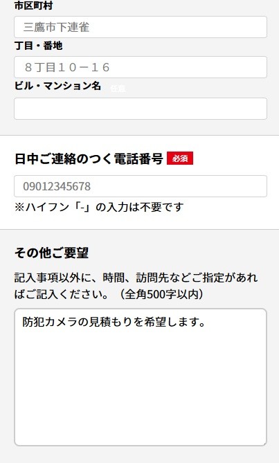 最後に、その他ご要望欄に「防犯カメラの見積もり希望」と書けば、見積依頼が完了します。