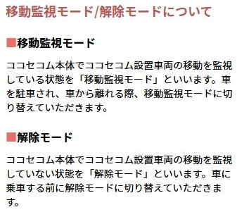 車に設置したGPS端末「ココセコム本体」を「解除モード」から「移動監視モード」に切り替えることで、愛車の移動をセコムが24時間365日監視します。