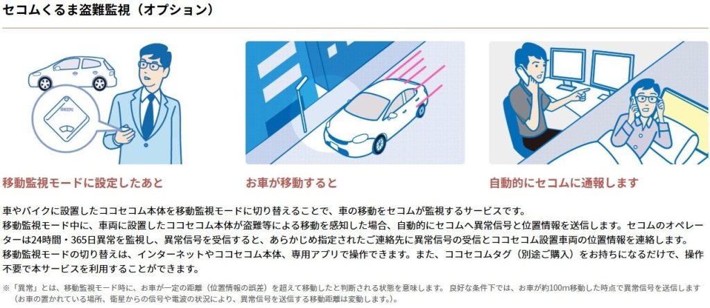 「防犯カメラで監視&強い光で不審者を威嚇する」「GPSで車の位置を把握する」「異常があればセコムが駆けつける」といった仕組みによって、愛車を24時間365日見守れるのが特長です。