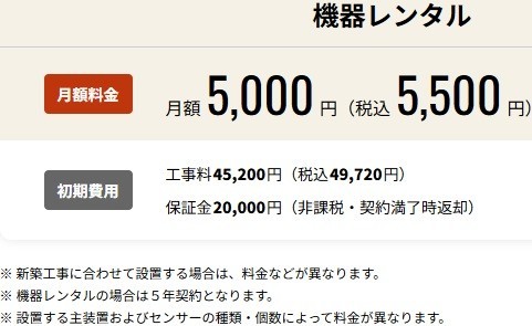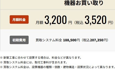 | 初期費用 | 207,350円 (内訳) 買い取りシステム料金 207,350円※1 保証金 0円 | 69,720円 (内訳) 工事費 49,720円 保証金 20,000円※2 |